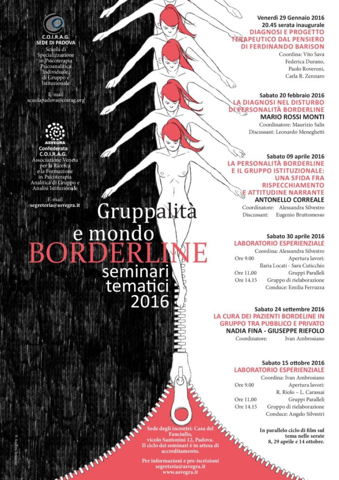 I seminari 2016 riprendono il tema della personalità borderline, con l’intento di proseguire il percorso aperto lo scorso anno e offrire nuovi stimoli di apprendimento dove il vertice gruppale, dall’equipè…