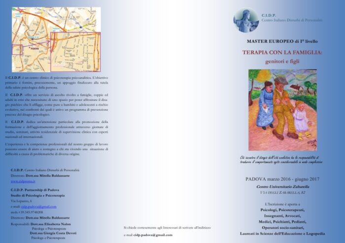Scarica la brochure: Brochure master europeo CIDP Padova 2016 2017 https://www.asvegra.it/curriculum-vitae-master-europeo-di-i-livello-terapia-con-la-famiglia-genitori-e-figli-c-i-d-p-centro-italiano-disturbi-di-personalita/
