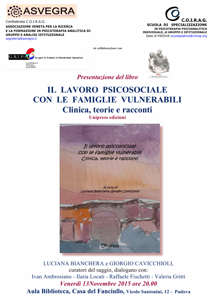 l’ Associazione Asvegra e la Sede di Padova della Scuola di Psicoterapia Coirag in collaborazione con Associazione G.R.I.P.O. e Associazione Amaltea organizzano Presentazione del libro IL LAVORO PSICOSOCIALE CON LE …