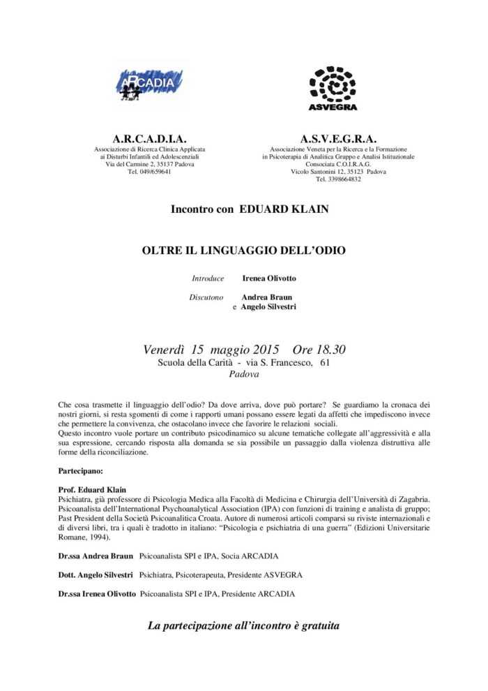 Associazione Asvegra, Associazione Arcadia e la Sede di Padova della Scuola di Psicoterapia Coirag organizzano due eventi che vedranno la presenza del Prof. Eduard Klain: OLTRE IL LINGUAGGIO DELL’ODIO venerdì…
